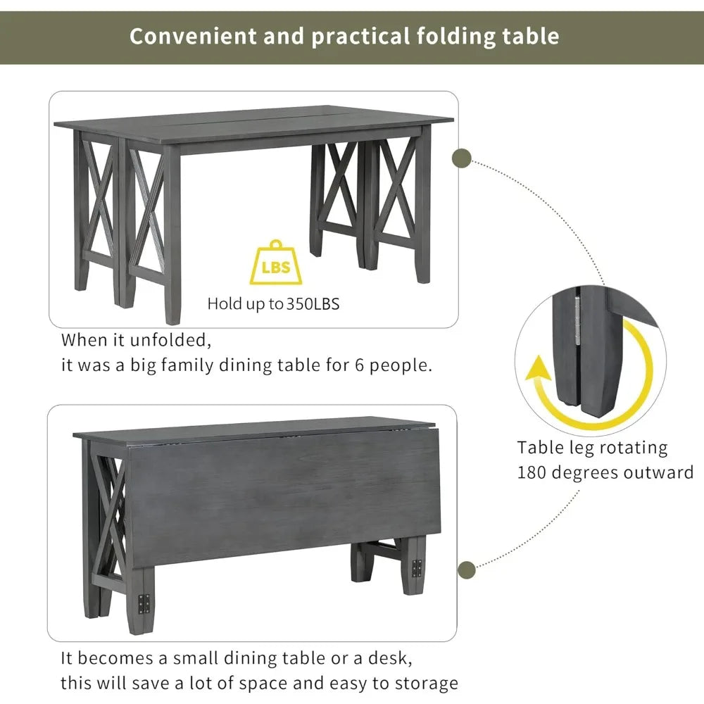 MKDK Rustic Farmhouse Foldable Dining Table Set With Upholstered Chairs And Bench Solid Wood