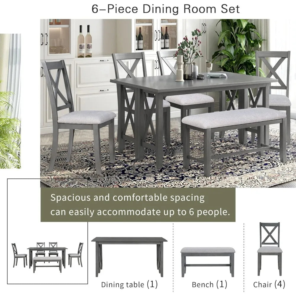 - Six-seat dining set: includes upholstered chairs and a bench with an X-shaped curved back, burlap cushions, and cone-shaped legs for comfort and style.