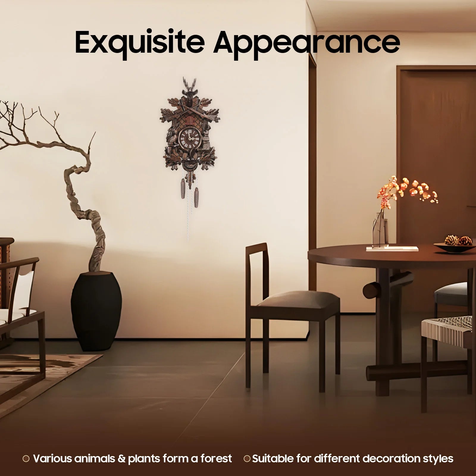 - Elegant design: noble forest-inspired detail with a gold dial that complements traditional interiors.