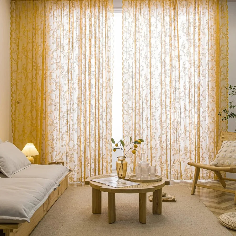 Elevate your windows with lace voile curtain panels featuring delicate floral embroidery for an airy, timeless touch that softly diffuses light and adds romantic depth.