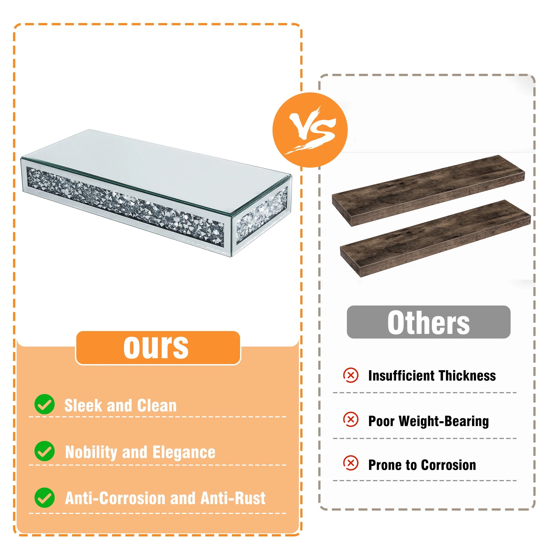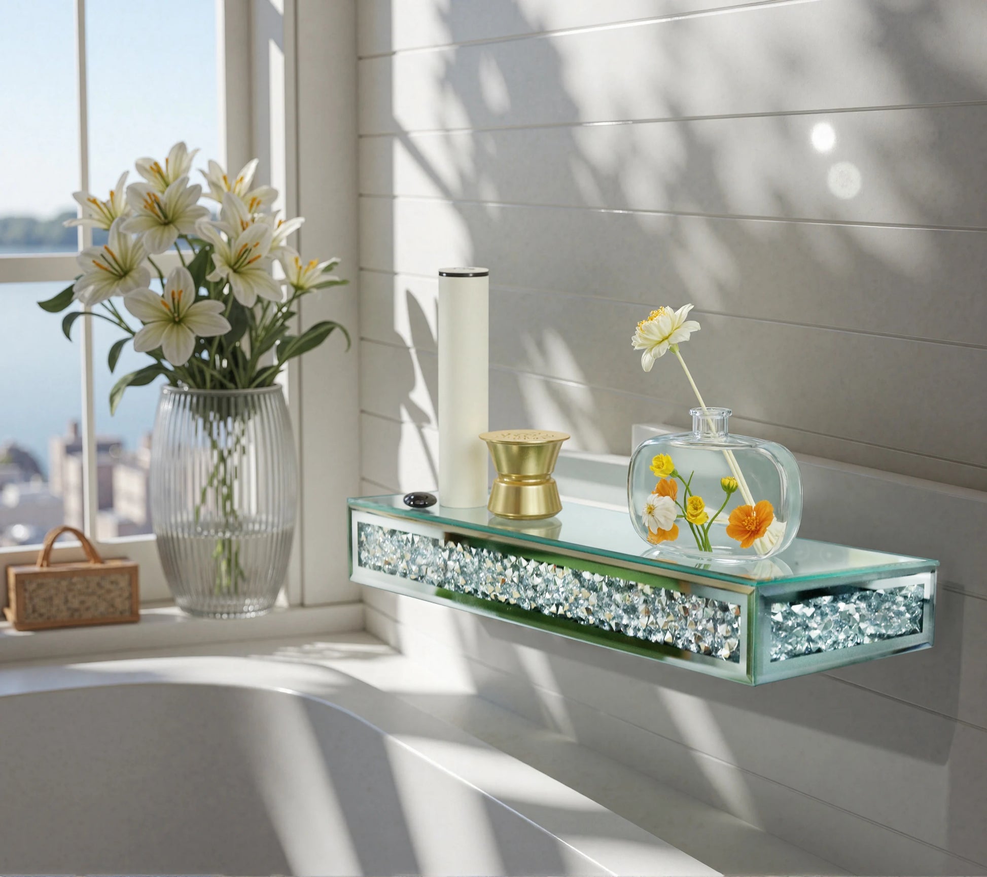 Elevate your space with a luxurious, crushed-diamond mirrored floating shelf that catches the light from every angle and elevates décor.