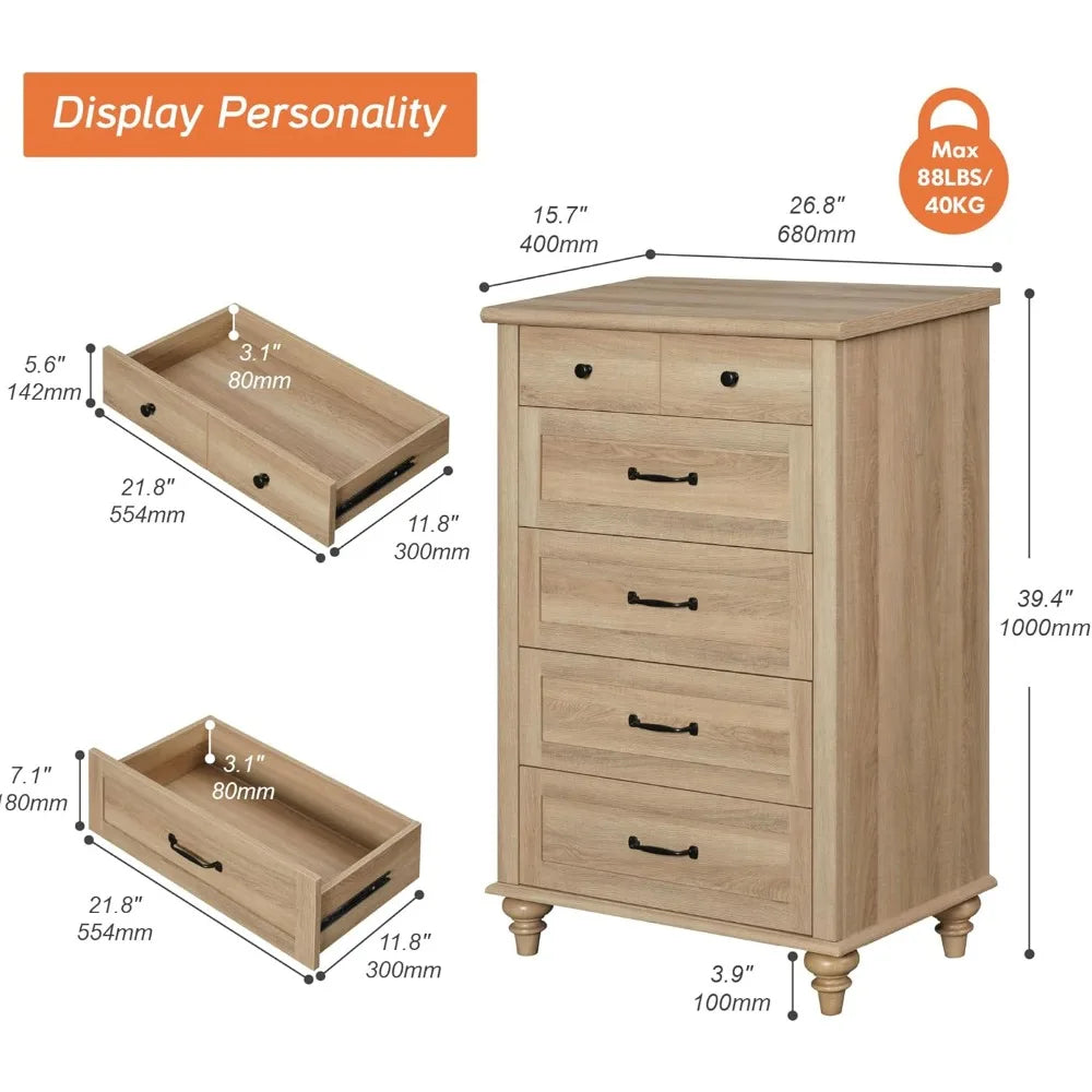 - Generous storage: With five deep drawers and a wide top, you gain space for clothes, toys, and daily essentials. Overall dimensions: 26.8" L × 15.7" W × 39.4" H.