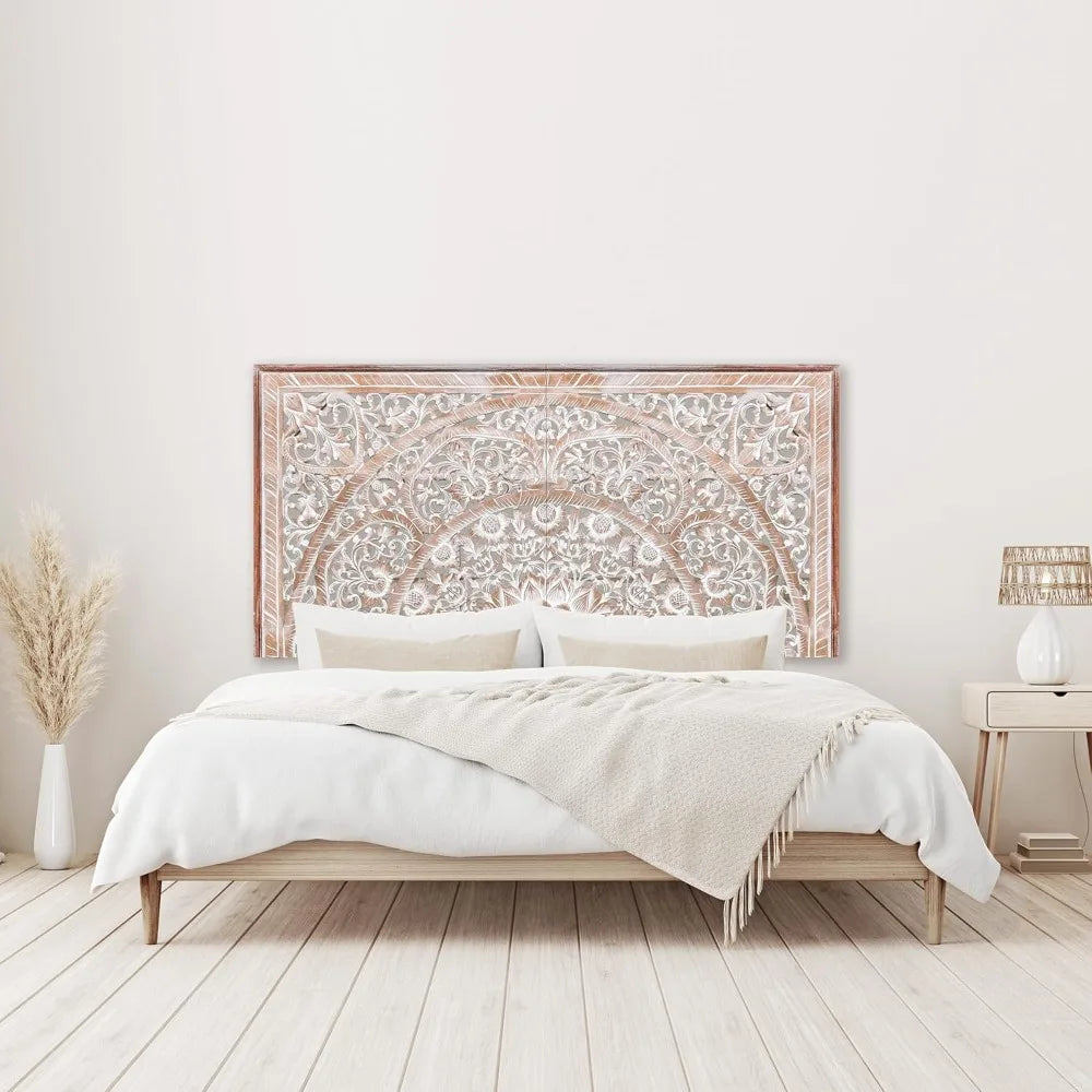 RBXCH Handcrafted PremiumHandcrafted White Washed Wood Headboard Wall Mount Carved