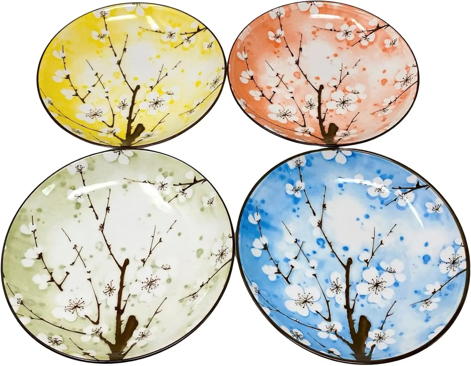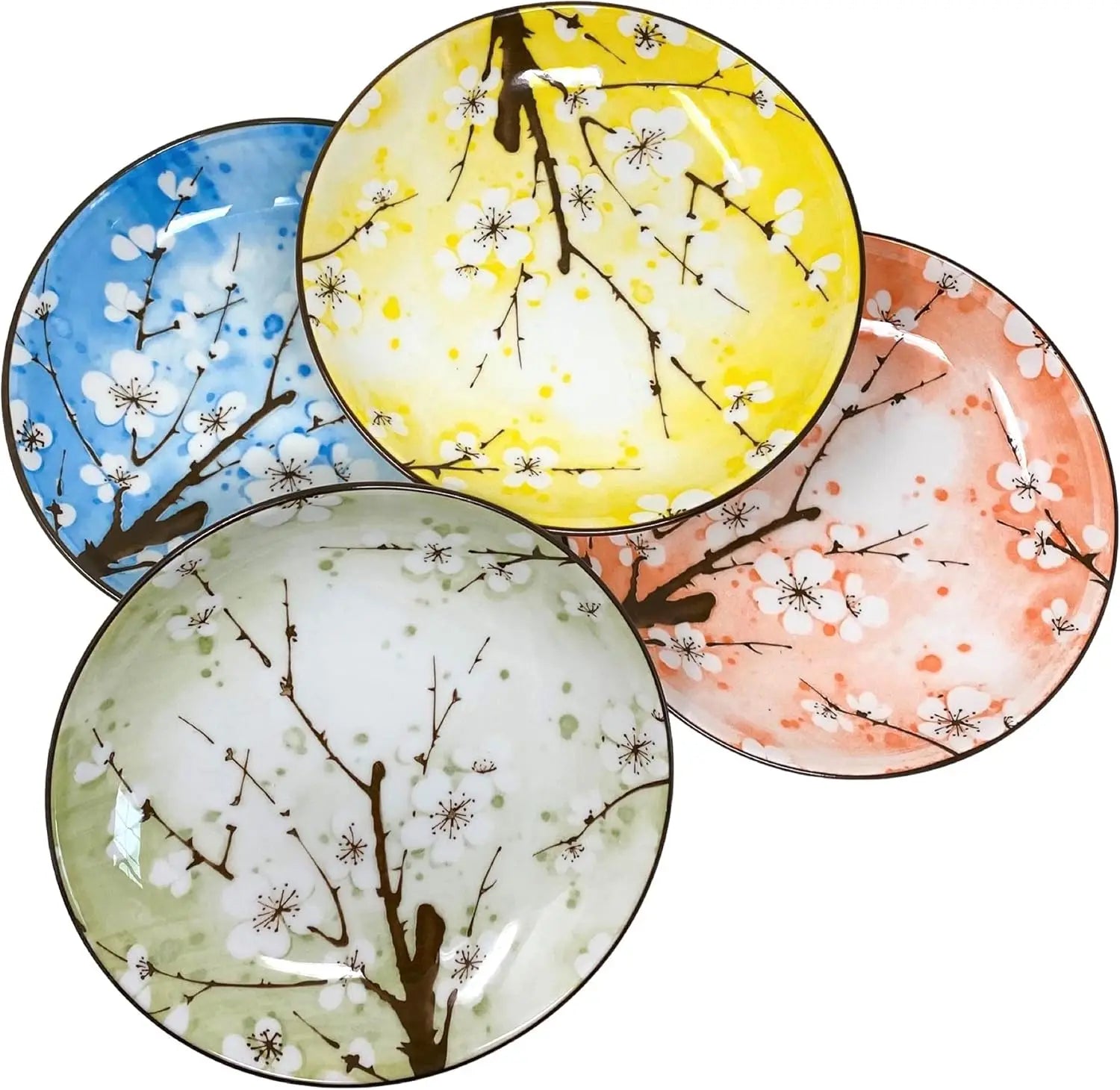 - Colorful cherry blossom styling: Four plates in assorted bright colors feature a cherry blossom design for a vibrant, decorative table.